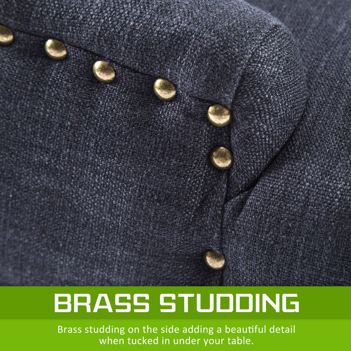 - Brass studding on the side adding a beautiful detail when tucked in under your table
