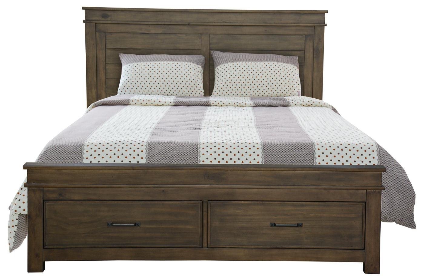 Some pieces of furniture instilled classic beauty in the bedroom. This queen bed,tallboy suite is entirely made up of such pieces of furniture.Crafted in the traditional style, the suite adorns your bedroom wonderfully. It turns it into a relaxing haven and also brings in extra storage space.The suite consists of 1 queen-size bed having 2 large storage drawers in the footboard; 1 tallboy with 6 sizable drawers; and 2 bedside tables with 3 drawers each. All the drawers have full metal extension runners and metal handles with an antiqued finish.A distinctive horizontal panelled headboard gives a sophisticated look to the bed. Further, a solid wood slat system with central support legs gives the bed great robustness. The entire furniture set is made of sustainably harvested solid pine wood. The wood is known for its amazing strength, great durability, shock-resistance, and ease of maintenance. The suite in a rustic grey finish goes well with a variety of interior decor styles, and a one-year warranty is included with the bed frame. The best part is that only the bed needs to be assembled in the entire suite.