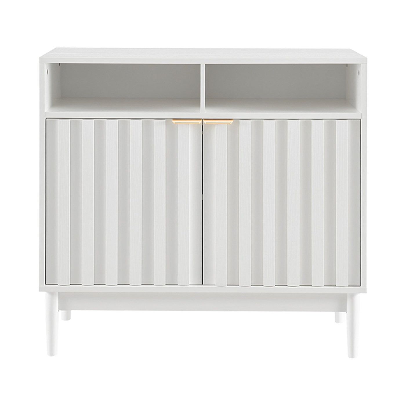 The Eleni sideboard is the perfect blend of elegance and rustic charm. With its modern farmhouse aesthetic, this 2-door cabinet features a sleek iron and oak effect finish. The fluted panels add a nice touch of sophistication and inside, youll find an adjustable shelf for great storage. Plus, the two open niches above the panel doors are just right for displaying your favourite decors or essentials. Supported by sturdy wood legs, this cabinet makes for a standout piece.