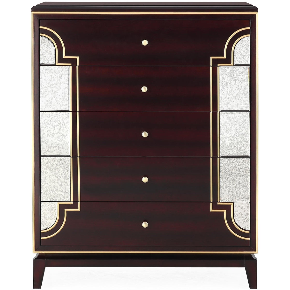 The colours in a bedroom should make you feel at ease. Fill your bedroom with Cherry and Antique Mirror colours by decorating it with this lovely queen bed and tallboy suit.An Art Decor inspired suite designed in the traditional style gives a relaxing feel to your bedroom. The colours make an elegant light-reflecting statement for the entire collection. The suite has one queen-size bed, one tallboy with 5 drawers, and two immensely beautiful nightstands with 3 drawers each- solving the storage space problem in your bedroom. All the drawers have full-extension metal runners, beautiful knobs, and are lined in black felt for an added touch of luxury. The drawers also have a brushed brass-look finish to coordinate with the hand-painted gold trim, adding to their aesthetic appeal.The bed features 3 adjustable support legs and a luxurious deep-buttoned headboard upholstered with Polyester Velvet Fabric. The whole furniture collection is made of solid timber: Cherry Veneer, Birch MDF, harvested in a sustainable way. The wood combination provides the furniture pieces with great strength and resilience. The MDF wood is resilient to moisture damage. The sleek suite goes with a variety of interior decor styles and comes with a one-year warranty. Only the bed needs to be assembled in the entire suite.